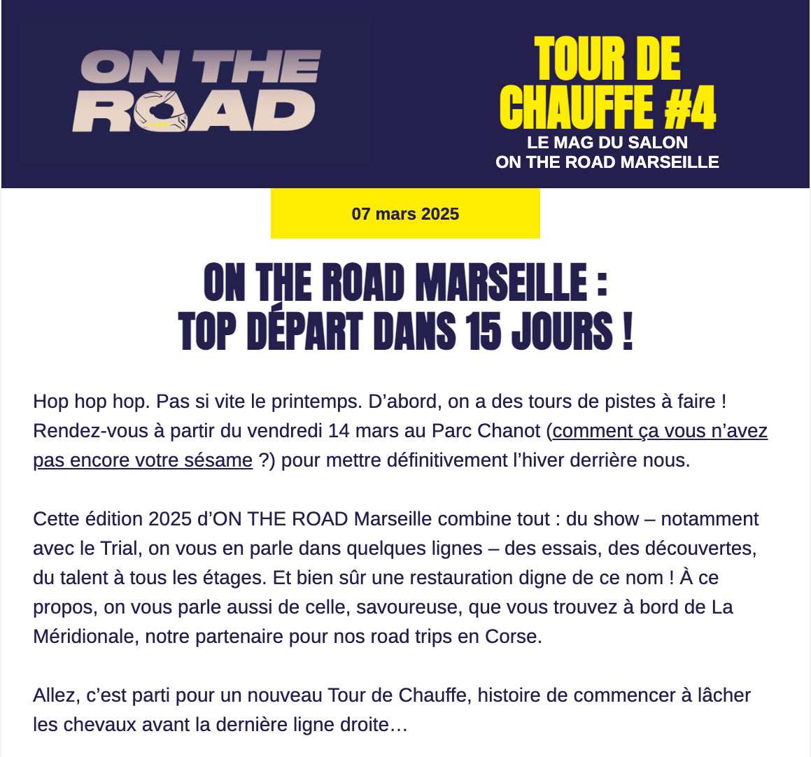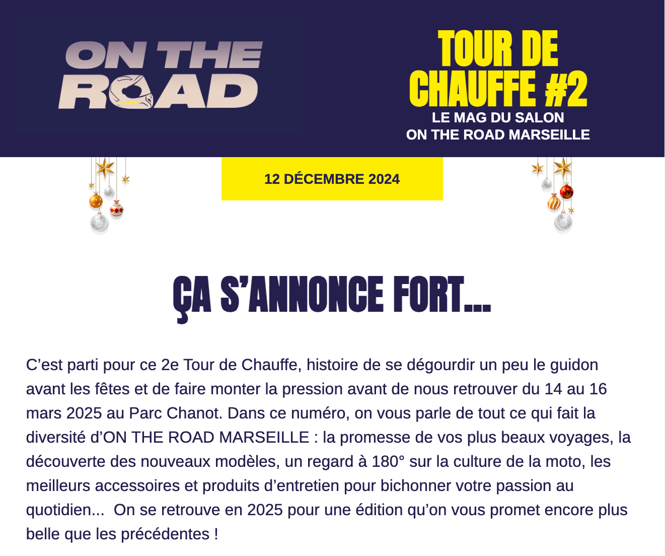 Du rêve, des machines, des offres, et une énergie unique à vivre dès avril à Marseille. ON THE ROAD, c’est bien plus qu’un salon : c’est votre rendez-vous passion, votre terrain d’émotions, votre futur garage à ciel ouvert.